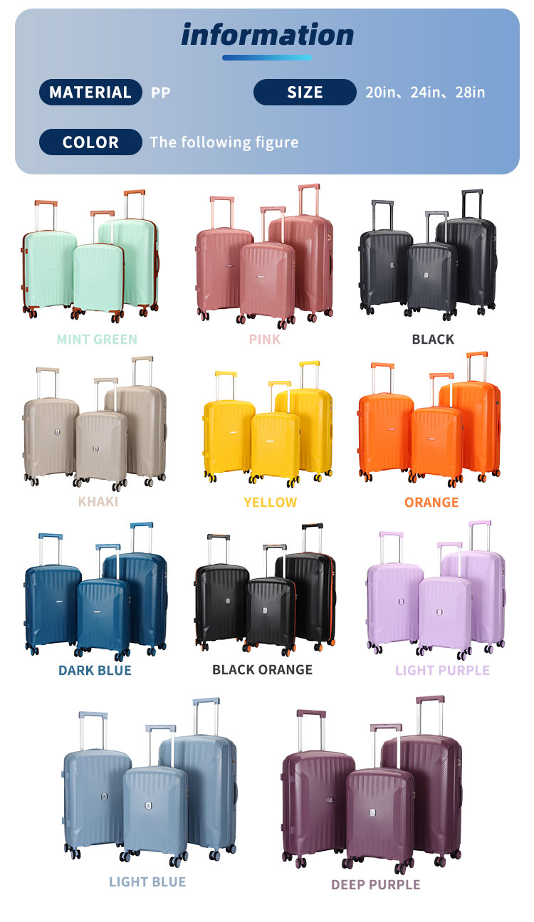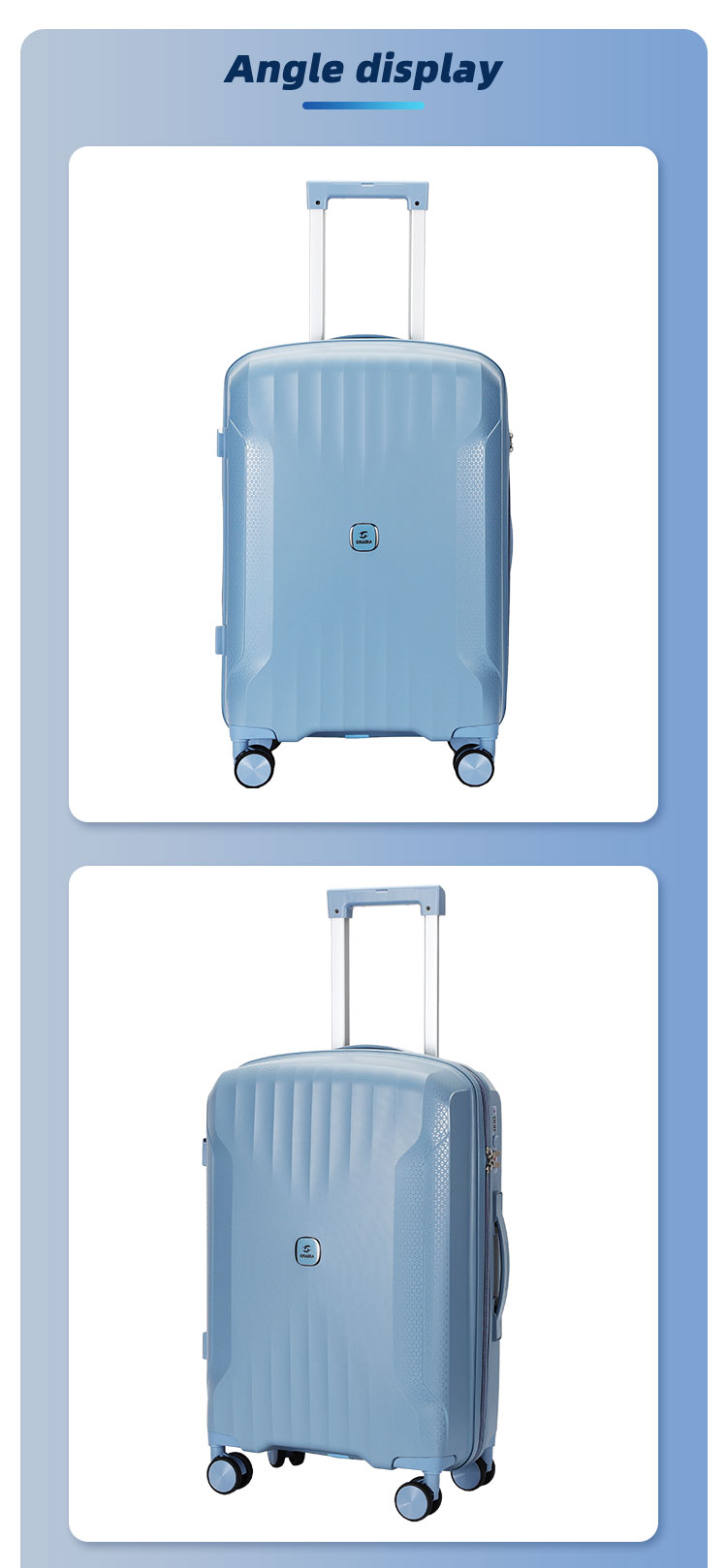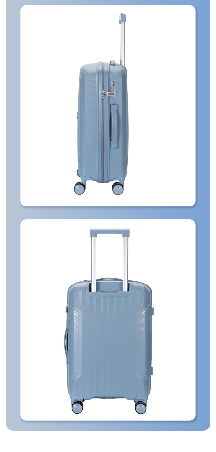 Discover the ultimate travel companion – our PP luggage. Lightweight yet durable, its high – quality PP material withstands the rigors of long – distance travel. Smooth – rolling wheels and a sturdy telescopic handle ensure easy maneuverability. With a spacious interior for all your essentials, it’s the perfect partner for your next adventure, whether it’s a business trip or a family vacation.