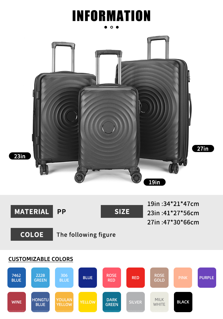 PP luggage is the perfect choice for travelers. Crafted from tough polypropylene, it’s lightweight yet incredibly strong, standing up to the knocks of journey. The wheels roll silently and smoothly, while the well – designed handle provides a comfortable grip. Inside, there are cleverly – arranged compartments to neatly stow your belongings. Travel hassle – free with PP luggage.
