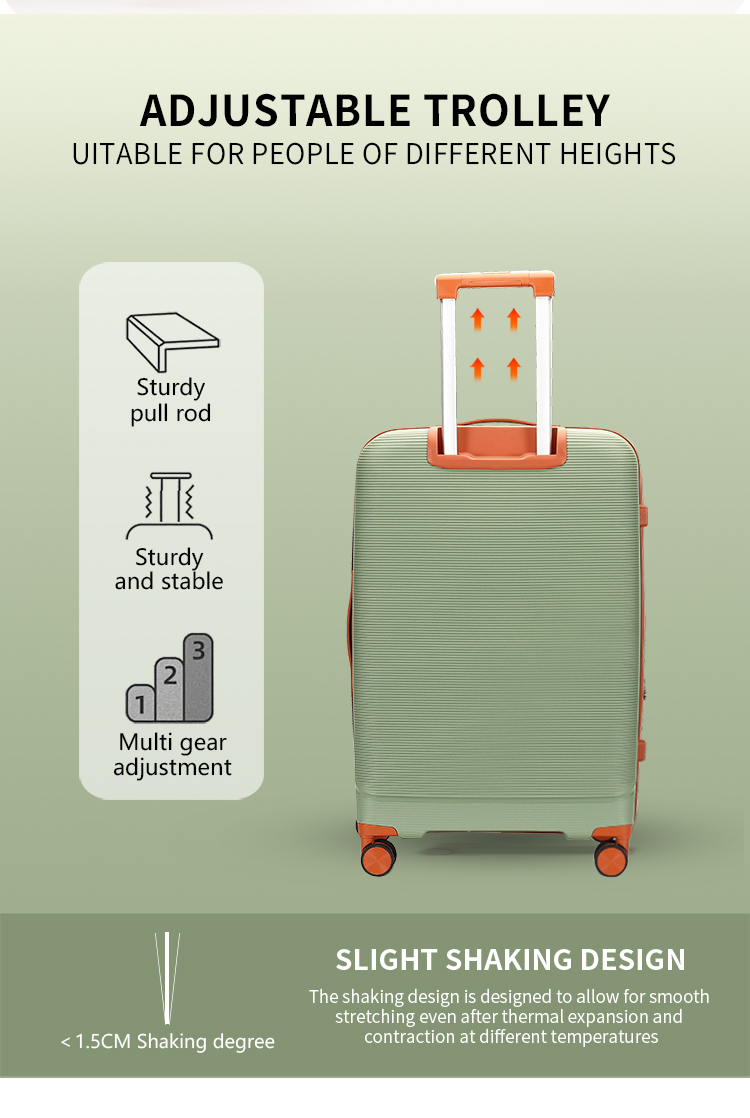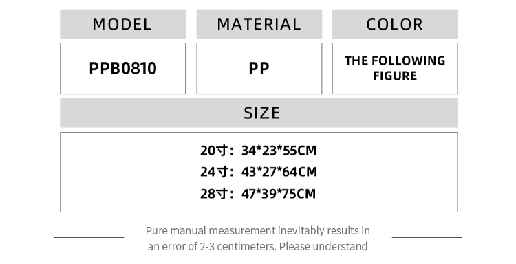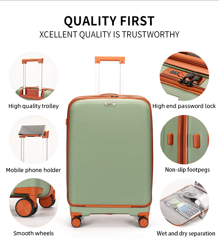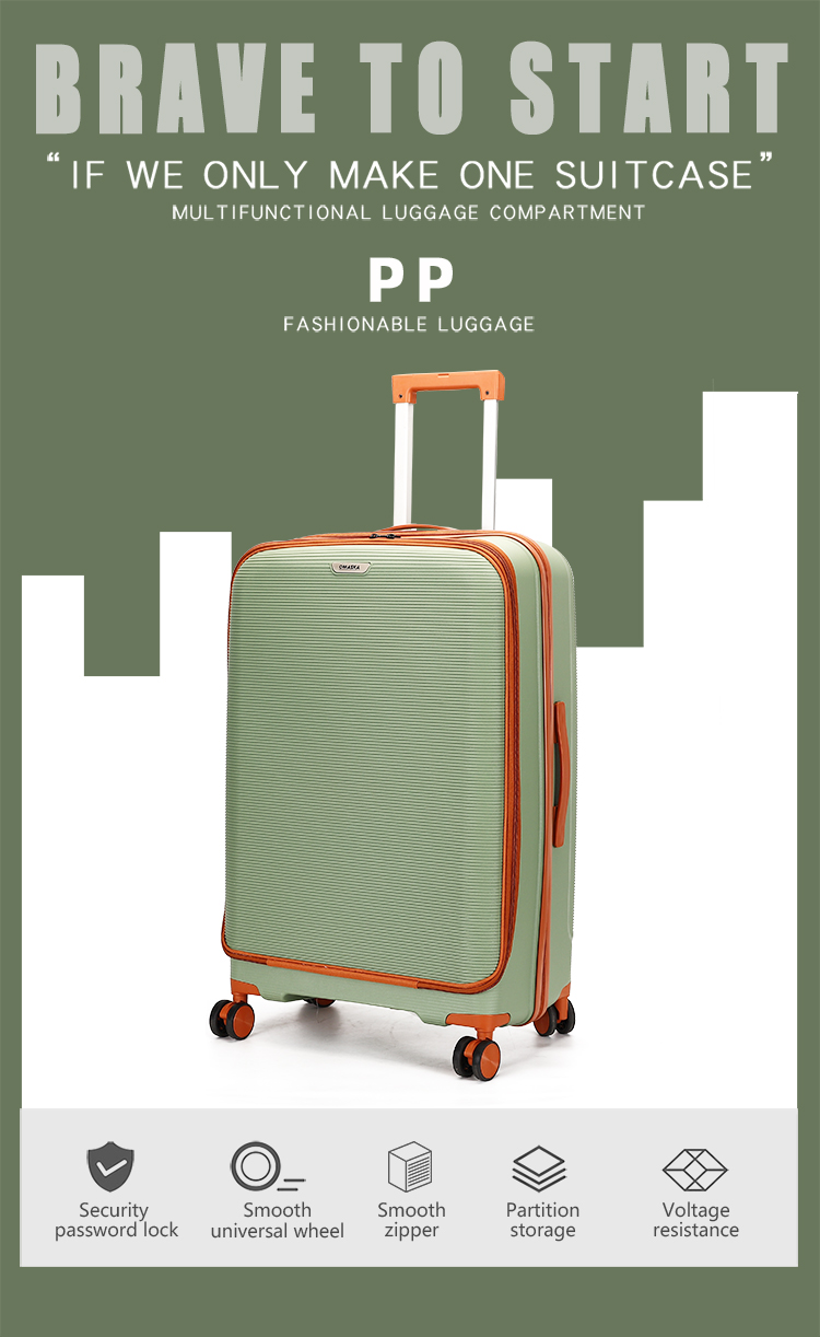 This OMASKA wholesale PP luggage set for men is a durable, waterproof, and fashionable choice. The convenient front opening cover provides easy access, and with sizes including 20, 24, and 28 inches, this set is built to handle every journey with ease.